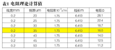 6413mm長(zhǎng),0.2mm寬的銅導(dǎo)線在不同銅厚下的電阻理論計(jì)算值如下表。R=ρ*L/S,ρ為材料電阻率 1.75*10-8Ω*m,L為導(dǎo)線長(zhǎng)度6413mm,S為導(dǎo)線橫 截面積,實(shí)際電阻上下限分別為:17.6Ω和14.4Ω。 理論計(jì)算當(dāng)銅厚在35um時(shí),0.2mm寬6413mm長(zhǎng)的導(dǎo)線才能達(dá)到理想電阻值16Ω。