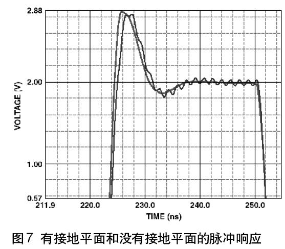 圖7中的振蕩示出了高速運(yùn)算放大器同相輸入端長度為2.54 cm的印制線的影響。其等效寄生電感為29 nH(10-9H),足以造成持續(xù)的低壓振蕩,會持續(xù)到整個(gè)瞬態(tài)響應(yīng)周期。圖7還示出了如何利用接地平面來減小寄生電感的影響。