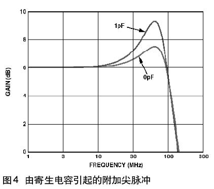 在高速電路中,很小的值就會影響電路的性能。有時(shí)候幾十個(gè)皮法(pF)的電容就足夠了。相關(guān)實(shí)例:如果在反相輸入端僅有1pF的附加寄生電容,它在頻率域可以引起差不多2dB的尖脈沖(見圖4)。如果寄生電容足夠大的話,它會引起電路的不穩(wěn)定和振蕩。