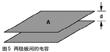 當(dāng)尋找有問題的寄生源時(shí),可能用得著幾個(gè)計(jì)算上述那些寄生電容尺寸的基本公式。公式(1)是計(jì)算平行極板電容器(見圖5)的公式。
