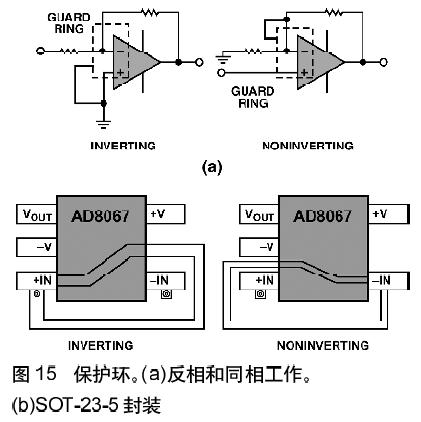 保護(hù)環(huán),或者說“隔離環(huán)”,是運(yùn)算放大器常用的另一種屏蔽方法,它用于防止寄生電流進(jìn)入敏感結(jié)點(diǎn)。其基本原理很簡單――用一條保護(hù)導(dǎo)線將敏感結(jié)點(diǎn)完全包圍起來,導(dǎo)線保持或者迫使它保持(低阻抗)與敏感結(jié)點(diǎn)相同的電勢,因此使吸收的寄生電流遠(yuǎn)離了敏感結(jié)點(diǎn)。圖15(a)示出了用于運(yùn)算放大器反相配置和同相配置中的保護(hù)環(huán)的原理圖。圖15(b)示出用于SOT-23-5封裝中兩種保護(hù)環(huán)的典型布線方法。