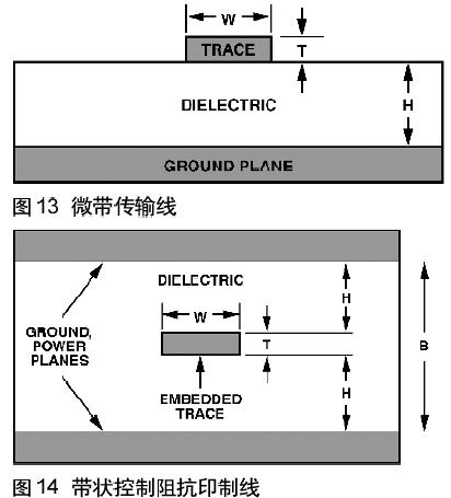 微帶控制阻抗印制線,如圖13所示,可以用在PCB的任意一面;它直接采用其下面的接地平面作為其參考平面。