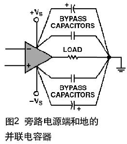 電源端接地:這種方法在大多數(shù)情況下都是有效的,采用多個(gè)并聯(lián)電容器將運(yùn)算放大器的電源引腳直接接地。一般說來兩個(gè)并聯(lián)電容就足夠了――但是增加并聯(lián)電容器可能給某些電路帶來益處。