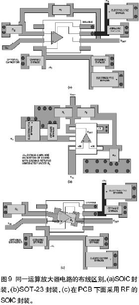 圖9示出了采用SOIC封裝(a)和SOT-23封裝(b)的運(yùn)算放大器之間的布線區(qū)別。每種封裝都有它自身的一些問題。重點(diǎn)看(a),仔細(xì)觀察反饋路徑就發(fā)現(xiàn)有多種方法連接反饋。重要的是保證印制線長度短。反饋路徑中的寄生電感會引起振鈴和過沖。在圖9(a)和9(b)中,環(huán)繞放大器連接反饋路徑。圖9(c)示出了另外一種方法――在SOIC封裝下面連接反饋路徑――這樣就減小了反饋路徑的長度。每種方法都有細(xì)微的差別。一種方法會導(dǎo)致印制線過長,會增大串聯(lián)電感。二種方法采用了通孔,會引起寄生電容和寄生電感。在給PCB布線時(shí)必須要考慮這些寄生效應(yīng)的影響及其隱含的問題。SOT-23布線差幾乎是理想的:反饋印制線長度短,而且很少利用通孔;負(fù)載和旁路電容從很短的路徑返回到相同的地線連接;正電源端的電容(圖9(b)中未示出)直接放在PCB背面的負(fù)電源電容的下面。