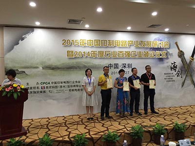 2015年7月27日,由中印制電路行業(yè)協(xié)會主辦的“2015年中印制電路產(chǎn)業(yè)發(fā)展研討會”在深圳明華際會議中心隆重召開,會議期間頒發(fā)了2014年度中印制電路行業(yè)百強企業(yè)證書。