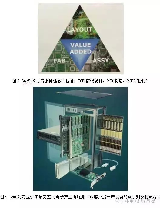 美PCB的核心競爭力之五在于其上、下游的整合能力以及向客戶提供一站式的服務(wù)能力,更突出其對于新產(chǎn)品研發(fā)的“快”之要求。大多數(shù)的美PCB工廠麻雀雖小、五臟俱全,有客戶的設(shè)計(jì)過程就已經(jīng)一起做了大量的溝通甚至參與或主導(dǎo)了設(shè)計(jì)工作之本身,故對于產(chǎn)品的特點(diǎn)了如指掌,生產(chǎn)起來自然也順利。一站式服務(wù)的內(nèi)容包括方案設(shè)計(jì)、信號完整性設(shè)計(jì)、PCB前端設(shè)計(jì)、PCB制造、PCBA組裝、裝配、測試等及相關(guān)工作。不同規(guī)模的公司,所提供服務(wù)的完整度和深度也各不相同,如圖8~圖10。 當(dāng)然,這些公司在大批量生產(chǎn)階段是無法參與的,在后階段的PCB大批量生產(chǎn)則轉(zhuǎn)到了中。