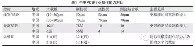 美PCB的核心競爭力之一在于其較強(qiáng)的制作能力,以表1從線寬線距、高層數(shù)、縱橫比等幾個(gè)指標(biāo)解析兩內(nèi)PCB工廠的能力。