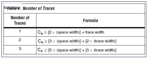 兩個過孔之間的區域被稱為走線通道。相鄰過孔焊盤之間的通道面積是信號布線必須經過的小面積。表1用來計算可以經過這個區域布線的走線數量。