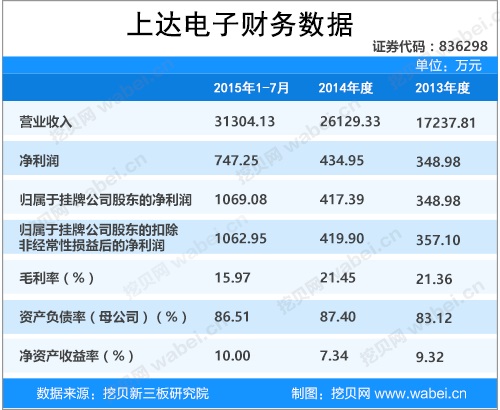 上達(dá)電子成立于2004年11月19日。公告顯示,上達(dá)電子2013年度、2014年度、2015年1-7月營業(yè)收入分別為1.72億元、2.61億元、3.13億元;凈利潤分別為348.98萬元、434.95萬元、747.25萬元。如下圖所示: