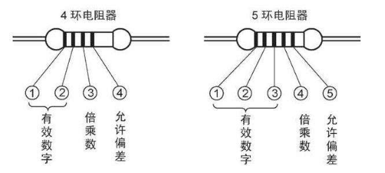 2、色環(huán)標注法使用多,一道色環(huán)表示阻值的大一位數(shù)字,二道色環(huán)表示二位數(shù)字,三道色環(huán)表示阻值未應該有幾個零,四道色環(huán)表示阻值的誤差。