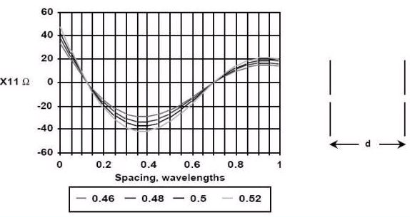 雙極是雙極數組的基本元素,一個圓柱狀雙極(cylindrical dipole)是大約在 l = 0。95(λ/2) 處共振。一個雙極近共振的饋點電抗,大約與縮短過的四分之一波長的Z0 =1000奧姆之電線相同。等效傳輸的阻抗是天線大小的函數,如下圖所示: