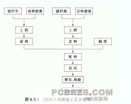 CEM-3 的制造工藝如圖8-3-5 所示,大體上分混膠、上膠、層壓三道工序。