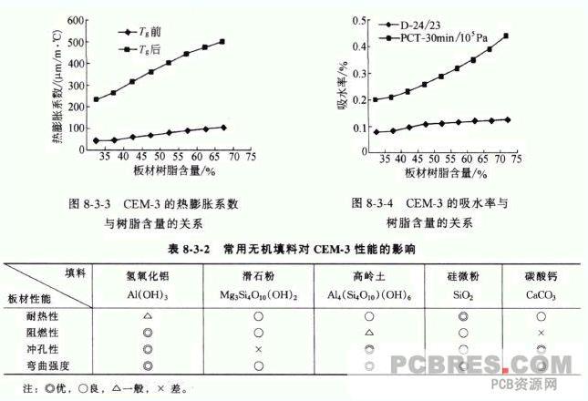 (3)無機(jī)填料無機(jī)填料是CEM-3 的重要組分之一,作為填充劑,它直接影響板材的尺寸穩(wěn)定性、通孔可靠性、耐潮濕性和機(jī)械加工性等。初的CEM-3 不含有無機(jī)填料,玻纖紙的含膠量大,使到板材有機(jī)物(環(huán)氧樹脂固化物)含量高達(dá)60% ,導(dǎo)致板材熱膨脹數(shù)和吸水率偏大,然而早期CEM-3 主要用于單面印制線路板,不需考慮通孔可靠性,耐潮濕性即使差一點(diǎn),問題也不大;隨著CEM-3 應(yīng)用范圍的擴(kuò)大,特別是在雙面印制線路板上的應(yīng)用,這些問題就暴露出來。后來,通過在芯料用膠液中加入無機(jī)填料,大大提高CEM-3的無機(jī)物比例,使板材中有機(jī)物含量和無機(jī)物含量的比例下降為40: 60 (質(zhì)量份) ,接近FR-4 水平,顯著地降低板材的熱膨脹系數(shù)和吸水率,圖8-3-3 、圖8-3-4 顯示了CEM-3 的樹脂含量(即有機(jī)物含量,通過無機(jī)填料用量來調(diào)整)與板材熱膨脹系數(shù)、吸水率的關(guān)系。CEM-3 常用的元機(jī)填料有氫氧化鋁、滑石粉、碳酸鈣、硅微粉、高嶺土等,它們對CEM-3 性能的影響見表8-3-2 。目前CEM-3 大量使用的無機(jī)填料是氫氧化鋁,氫氧化鋁含有3 個結(jié)晶水,在200 - 500 C條件下,不同程度釋放出水,在釋放水時,需吸收大量的熱量,所以氫氧化鋁也是一種理想的"潔凈"阻燃劑,氫氧化鋁的粒徑越小,阻燃效果越好;但是,氫氧化鋁會影響板材的耐熱性、耐浸焊性, PCB 加工熱風(fēng)整平、元件焊接的溫度都接近氫氧化鋁的分解溫度,如果時間較長,高溫下氫氧化鋁受熱分解,板材會分層起泡;近年有廠家研究對氫氧化鋁進(jìn)行熱處理,脫去部分在200 多度開始分解的結(jié)晶水,可大大提高氫氧化鋁的熱分解溫度,這種含有1. 8-2.9 個結(jié)晶水的氫氧化鋁已開始供應(yīng)市場。