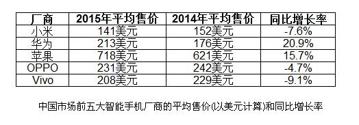 蘋果鞏固了其三的位置(如下圖所示),市場份額從2014年的8.8%增加至2015年的13.4%,平均售價提高15.7%至718美元,增加近100美元。