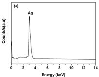 由加入還原劑硼氫化鉀和分散劑PAAS得到的納米銀樣品進行EDX元素和SAED分析結果,分別如圖4 (a)和(b)所示。從圖4 (a)看出,得到的為純銀,無其他雜元素存在;圖4(b)的SAED分析表明,得到的納米銀是單晶,再次證明無其他氧化物或者其他晶態物質存在。