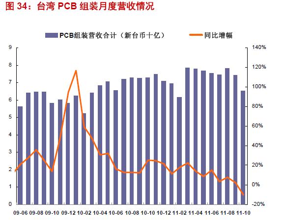 臺灣 PCB 產業10 月份營收合計269.30 億新臺幣,環比微跌0.12%,同比增長14.03%。PCB 組裝業10 月份營收合計為65.46 億新臺幣,同比下滑10.11%,環比再次負增長11.95%。